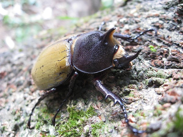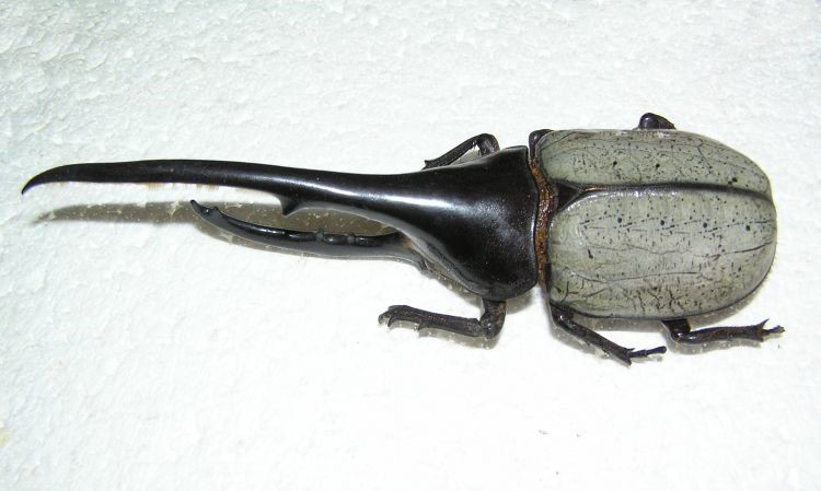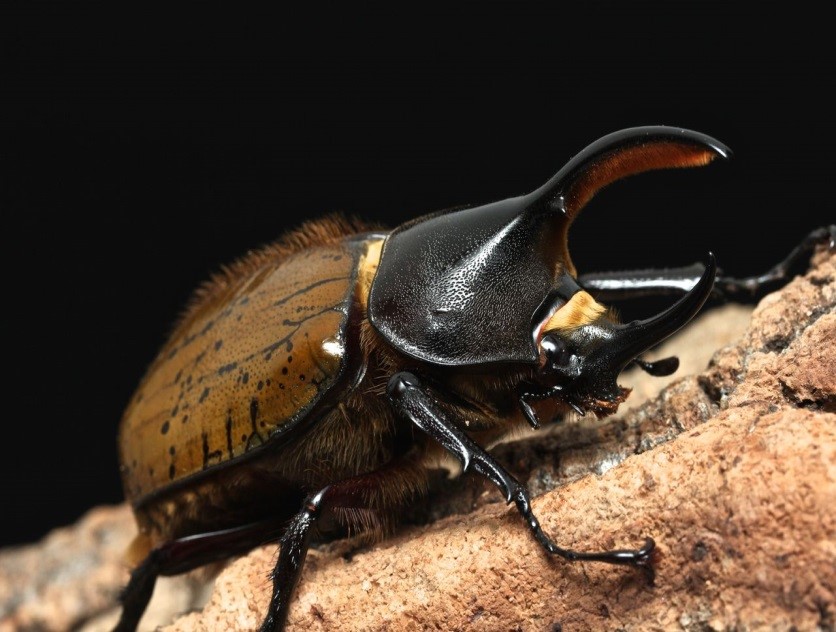 最も長い頭角は頭部に胸角は胸部につき、国産カブトムシとは全く真逆の形態です。腹部には黄土色の上翅・下翅を持ち、その下には呼吸に必要な気門を兼ね備えます。