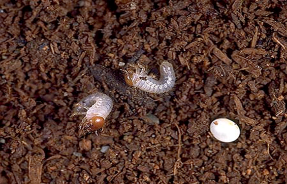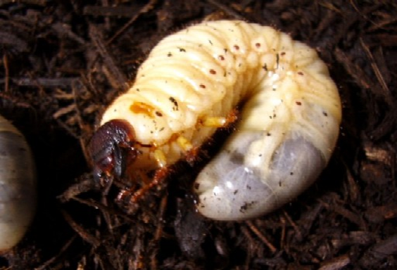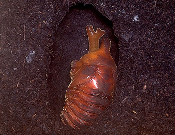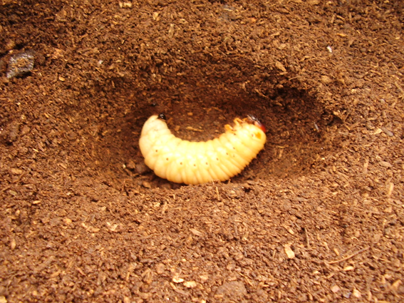 完全に終齢幼虫が蛹化した状態。国産カブトムシ(ヤマトカブトムシ)は他のカブトムシと異なり“縦型”の蛹室を作る。