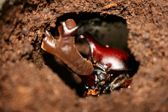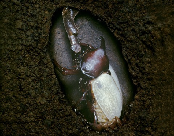 無事蛹室内で硬質化し地表に出てくる新成虫です。頭角にはまだ蛹殻がついていますが、しばらくすると乾燥し抜け落ちます。