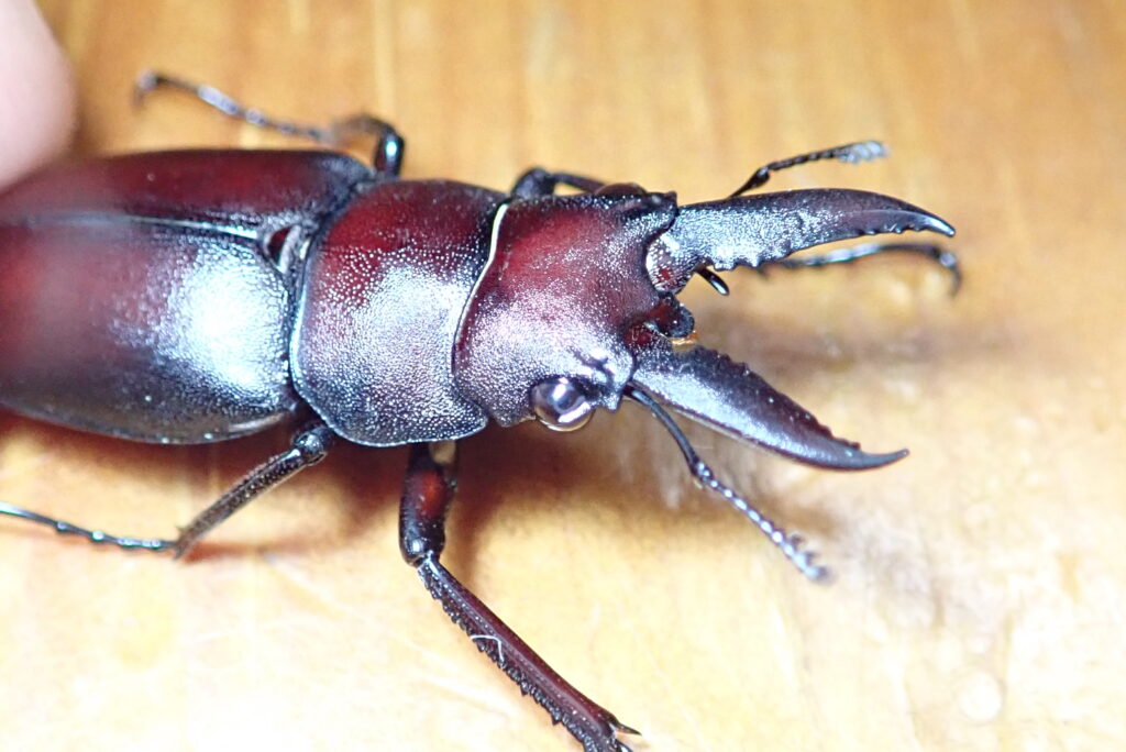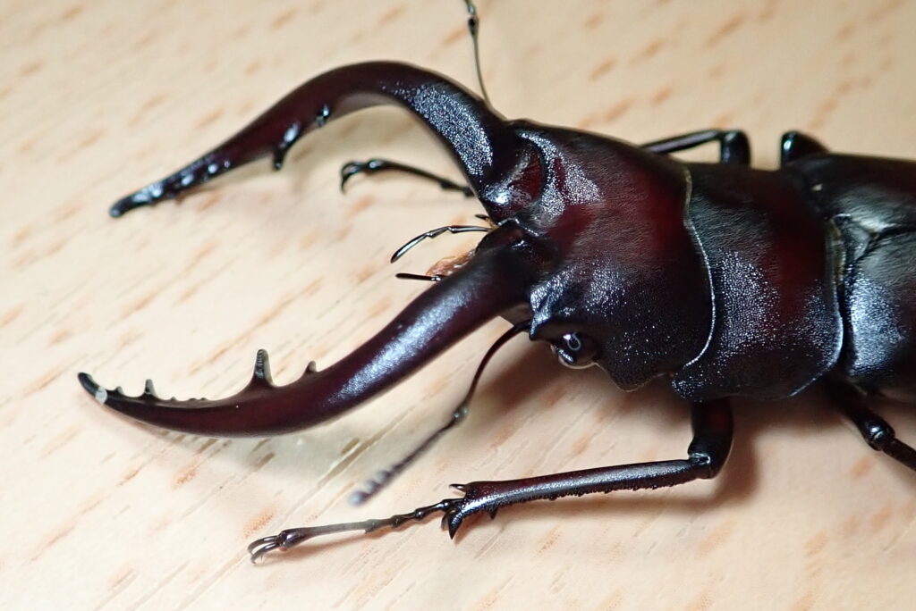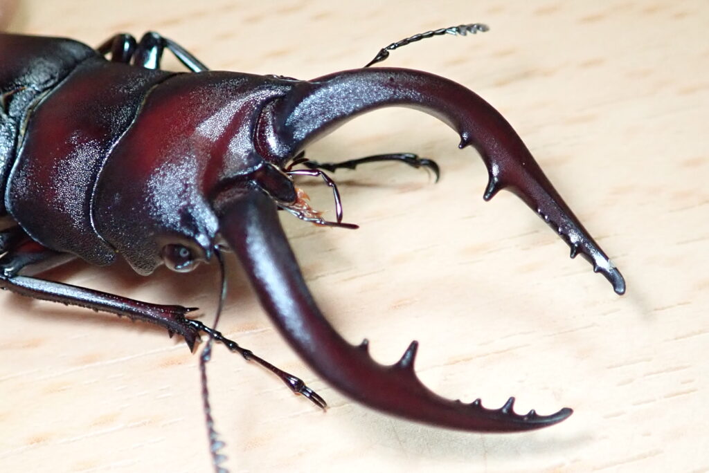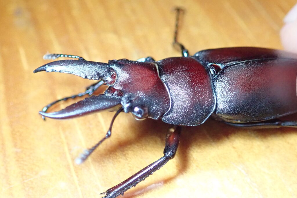 ノコギリクワガタの最大の特徴は、名前の通りノコギリ状の歯を持っていることと、色合いが少し赤みを帯びていることですね。