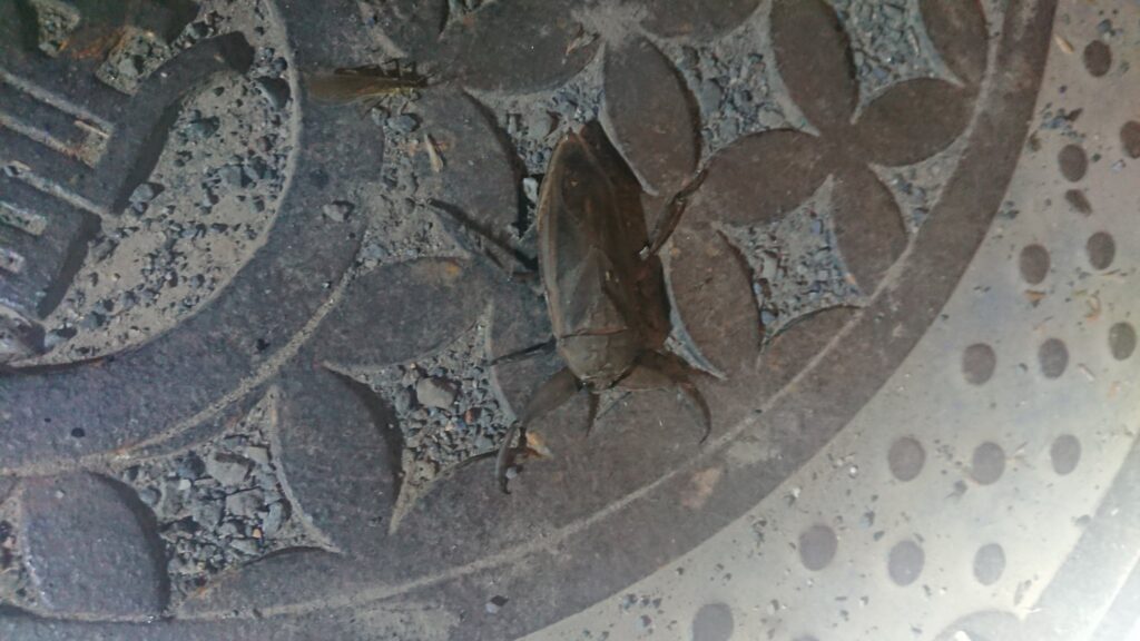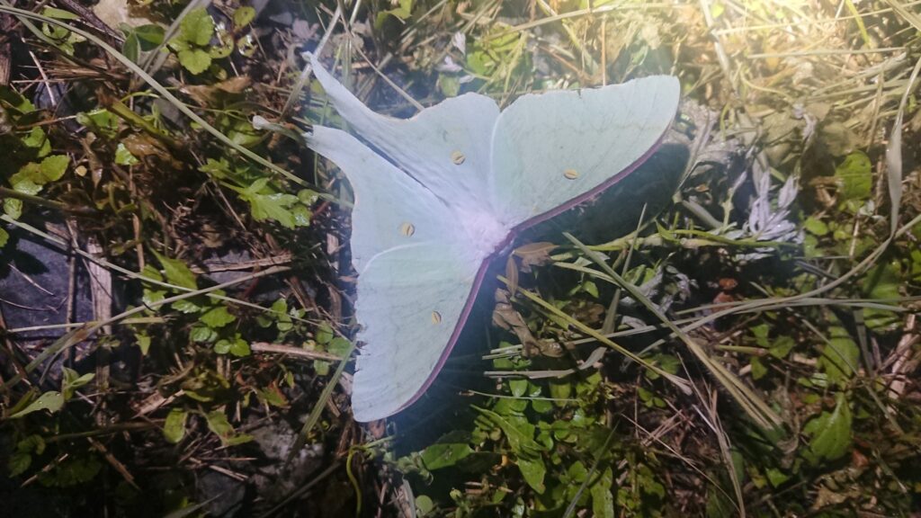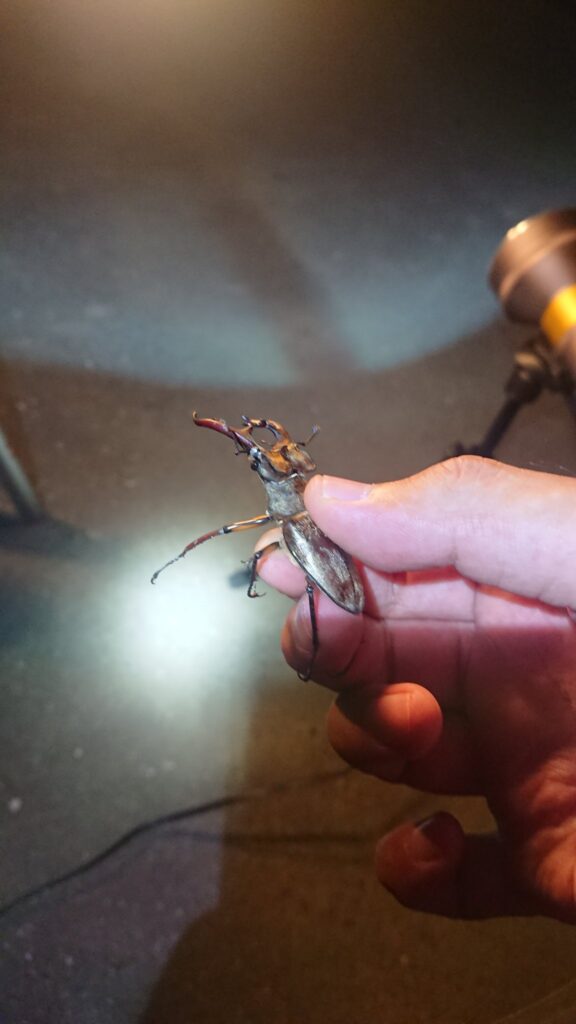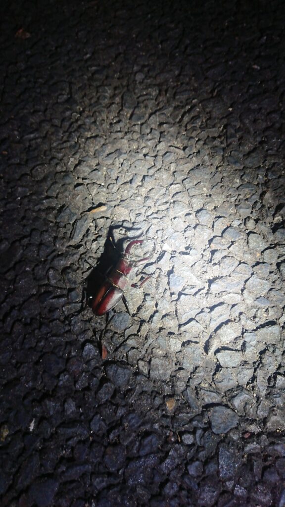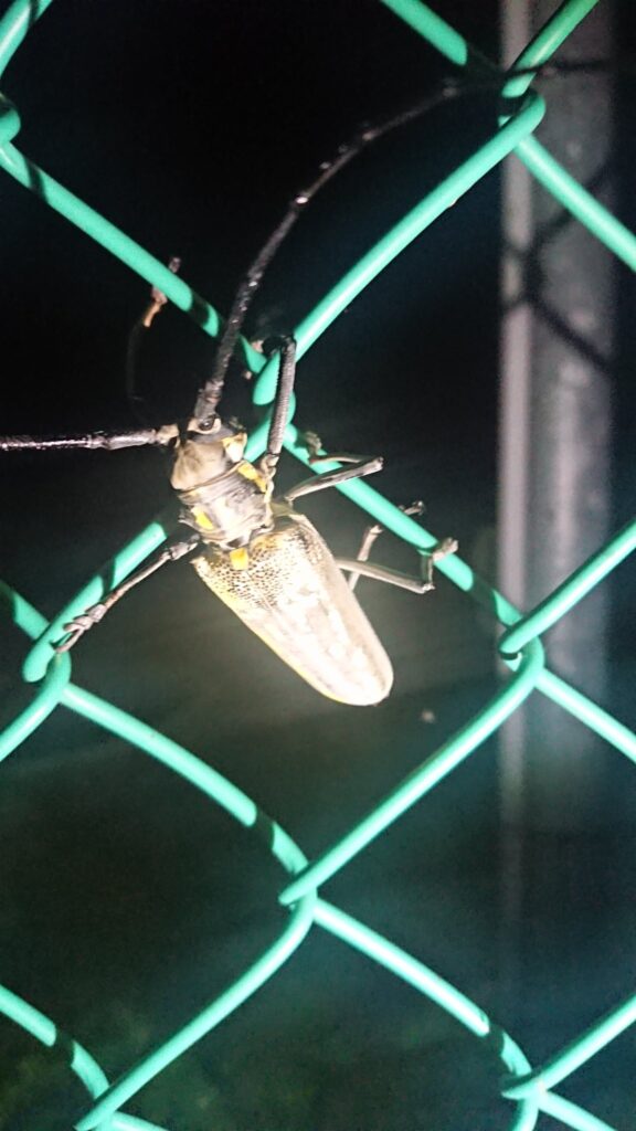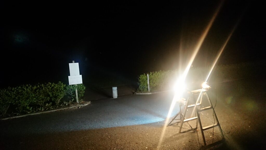 ライトの元へ沢山の昆虫が飛来します。近くへ行くと服にも付いてくるので注意。気付かずに車内へ入れてしまう事が良くあります。