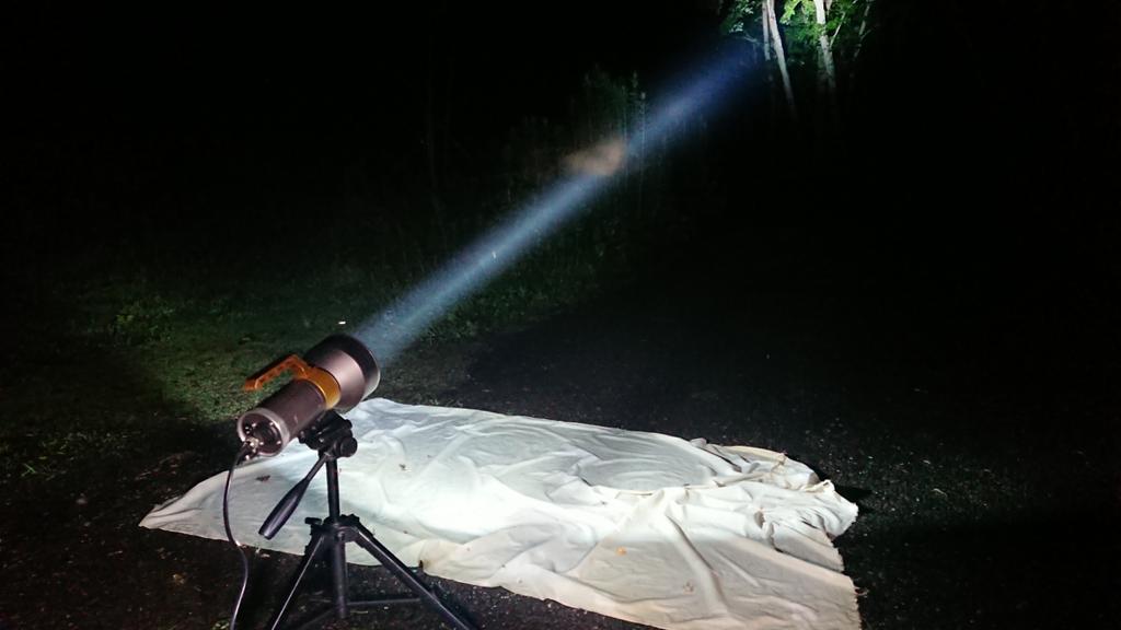 樹液採集と違い、投光器を用いれば昆虫を自分の居場所におびき寄せることができます(使用する道具については詳しくは投光器(上級編)を参照)。わざわざ夜の雑木林を歩き回らなくて済むので比較的安全です。カブトムシやクワガタに限らず、場所によっては大型の蛾であるオオミズアオや貴重な水生生物のタガメも飛来してくることがあります。